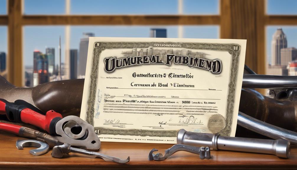 You'll also need to pass a licensing exam that tests your plumbing knowledge and skills. Additionally, securing a surety bond is vital, as it ensures compliance with local regulations and offers financial protection against potential losses.
